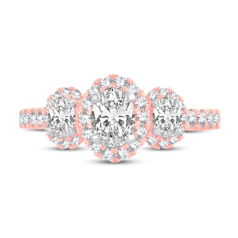 A gorgeous 1/2-carat oval-cut diamond shines at the center of this three-stone engagement ring, flanked by two smaller oval-cut diamonds. Each center diamond is haloed by brilliant round diamonds, and more sparkle down each side of the band. The ring is crafted in romantic 14K rose gold and has a total diamond weight of 1 3/4 carats. From the Now & Forever® bridal collection.