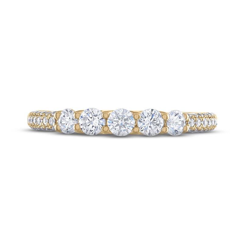 This radiant anniversary ring for her showcases a beautiful array of sparkling round diamonds. The band is adorned with two rows of brilliant round diamonds. Crafted in classic 14K yellow gold, this ring has a total diamond weight of 5/8 carat. From the Now and Forever® bridal collection.