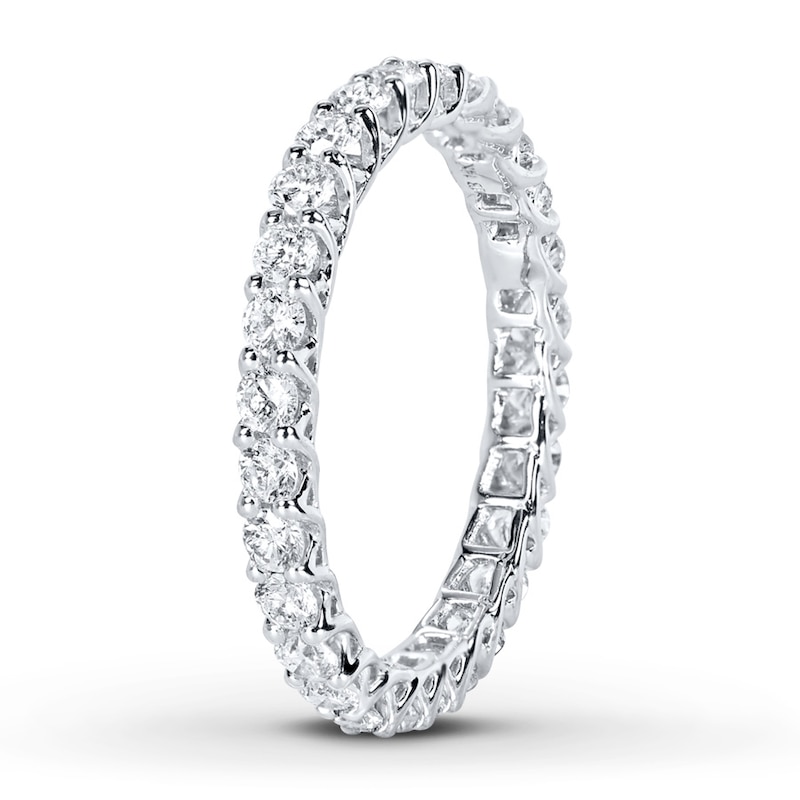 Sparkling round diamonds encircle the band of this eternity ring, suggesting a love that never ends. Crafted of 14K white gold, the ring has a total diamond weight of 1 carat.