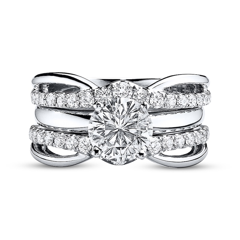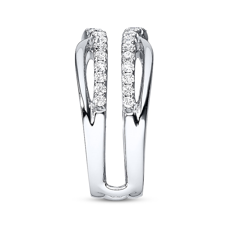 This breathtaking THE LEO Diamond® enhancer ring features a peak of round diamonds cresting above and below a space to insert her solitaire engagement ring (sold separately). Curves of 14K white gold along the band complete the look. The ring has a total diamond weight of 3/4 carat.