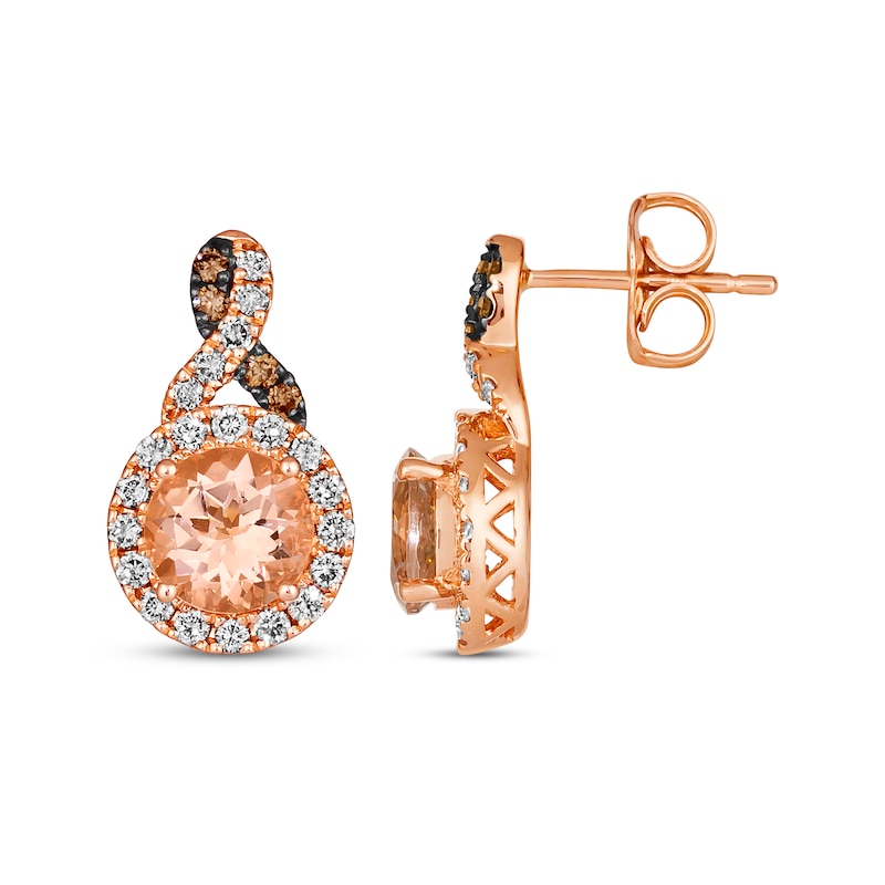 Each of these luscious Le Vian® earrings from the KAY exclusive Chocolate Twist™ collection showcases an exquisite round-cut Peach Morganite™ wrapped in a halo of round Nude Diamonds™. Ribbons of round Chocolate Diamonds® and round Nude Diamonds™ interweave up the twisted design, which is crafted in sweet 14K Strawberry Gold®. The earrings have a total diamond weight of 3/8 carat and secure with friction backs. Le Vian®. Discover the Legend.