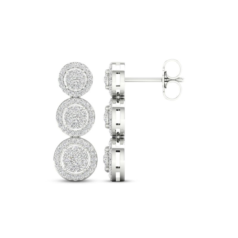 These sensational drop earrings feature three circular clusters of radiant round-cut diamonds, which graduate gently in size from top to bottom. Each cluster is haloed by more round diamonds for a total diamond weight of 1/2 carat. The earrings are crafted in cool 10K white gold and secure at the post with friction backs.