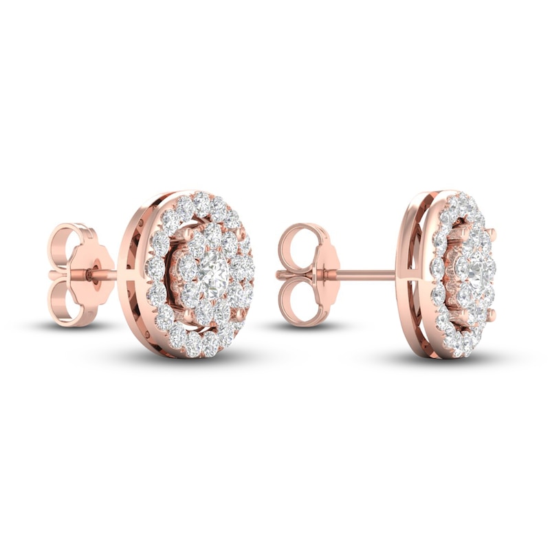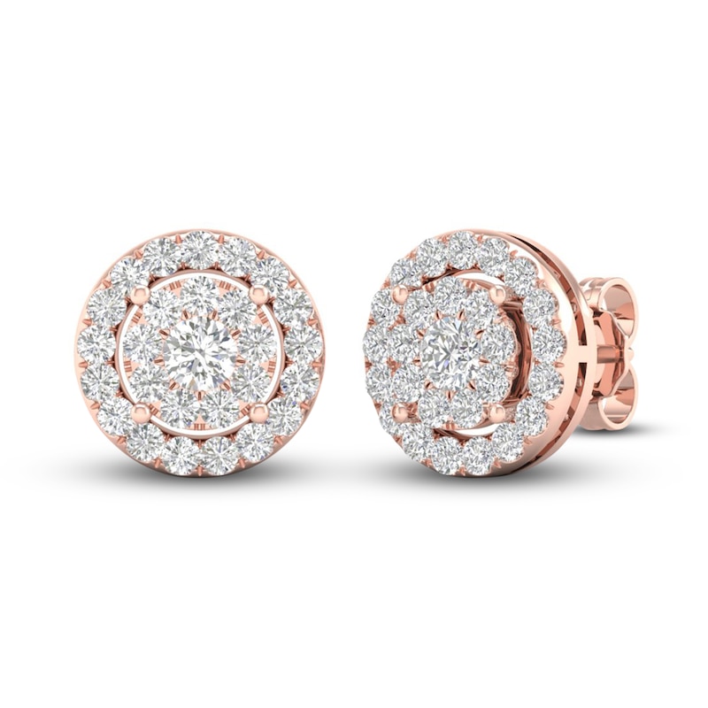 These stunning diamond earrings will be treasured forever. Bright center clusters of round-cut diamonds shine even brighter amidst sparkling halos of more round-cut diamonds emitting a dazzling display of sparkle. The earrings are fashioned in iconic 10K rose gold with a total diamond weight of 1 carat and secure with friction backs.