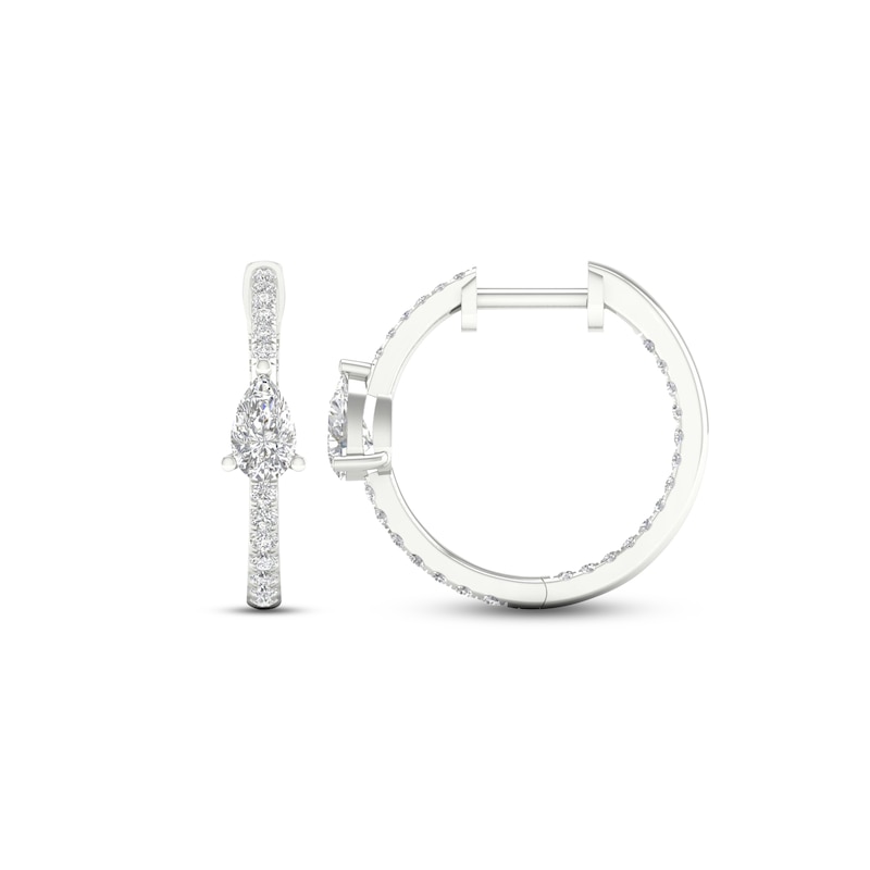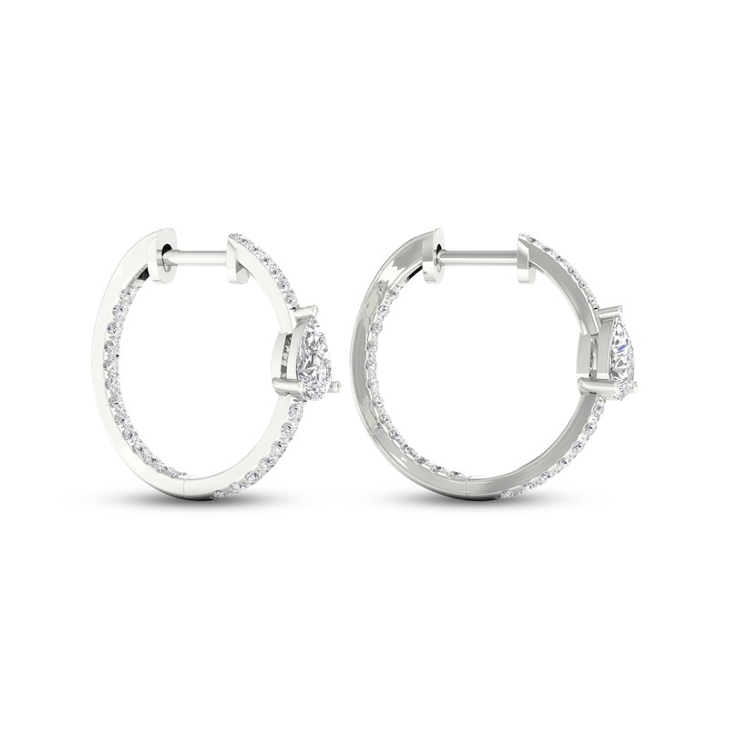 Beautifully brilliant, these huggie hoop earrings showcase a shimmering pear-shaped diamond. Round diamonds sweep down the 14K white gold setting, giving the pair a total diamond weight of 1 carat. The earrings secure with hinged backs.