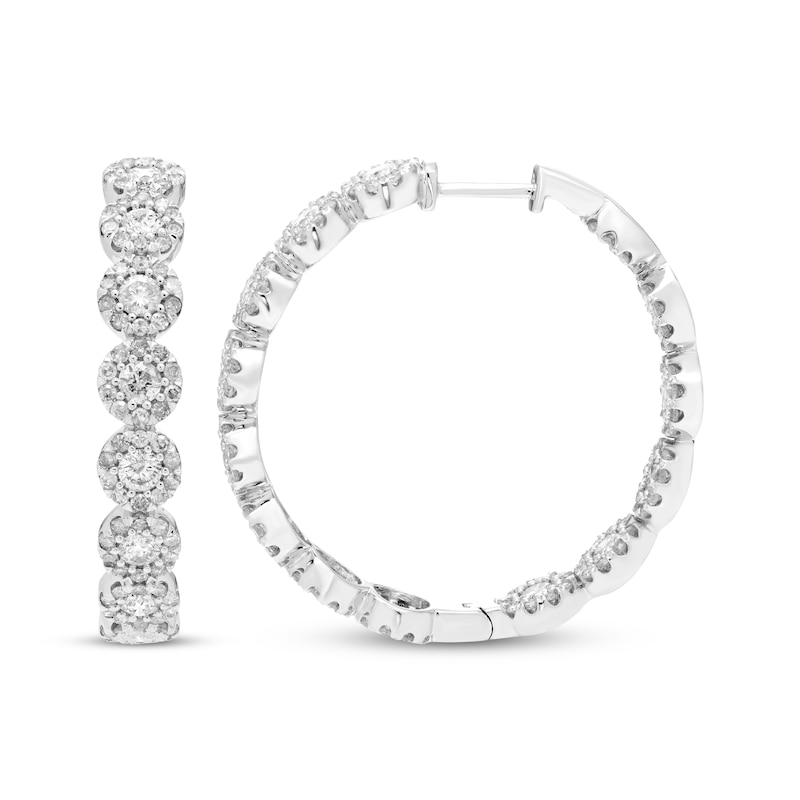 These spectacular hoop earrings have all the sparkle any outfit needs. Brilliant round diamonds are haloed by smaller round diamonds along the front and inside-back, creating a sophisticated scalloped silhouette. The earrings are styled in 10K white gold, have a total diamond weight of 3 carats and secure with hinged backs.