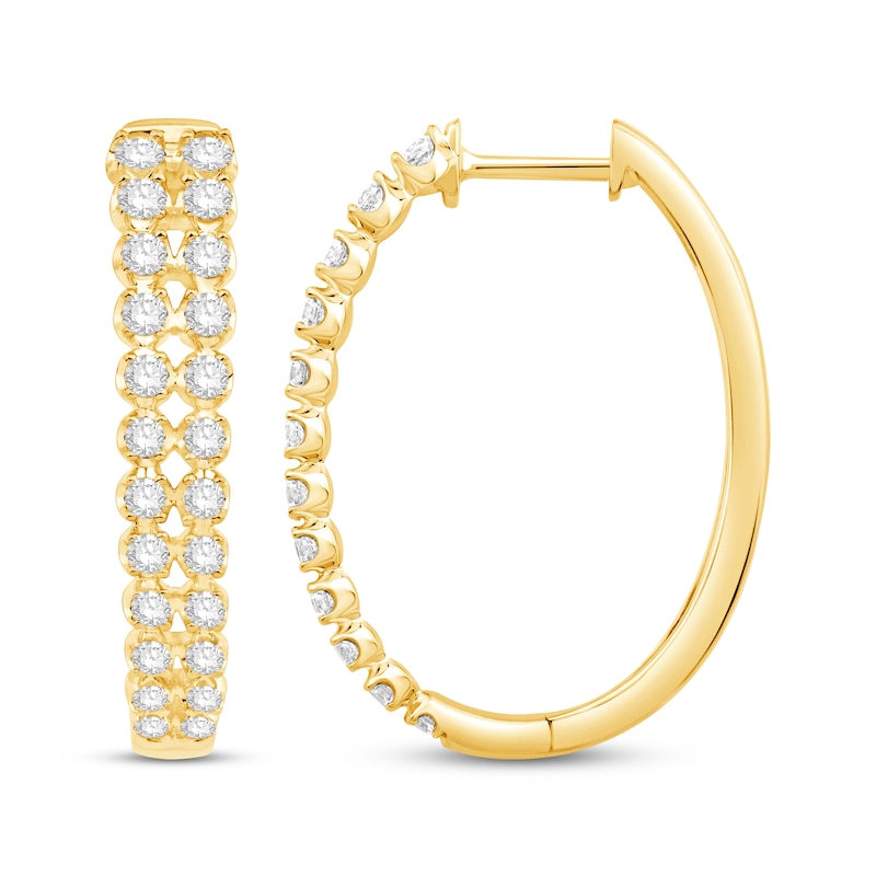Lend glimmer to your look with these double-row hoop earrings. In bright 10K yellow gold, these hoops feature two tapered rows of round diamonds. With a total diamond weight of 1 carat, these earrings secure with hinged backs.