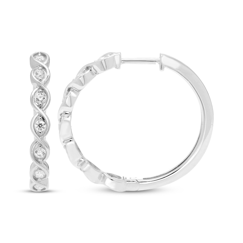 Life isn’t measured in minutes but in moments of love. These hoop earrings celebrate every moment you share—because every moment together is a gift. Each earring features round-cut diamonds surrounded by swirling infinity symbols. Styled in 14K white gold, these hoops have a total diamond weight of 1/2 carat and secure with hinged backs. From the Every Moment collection, exclusively at KAY.