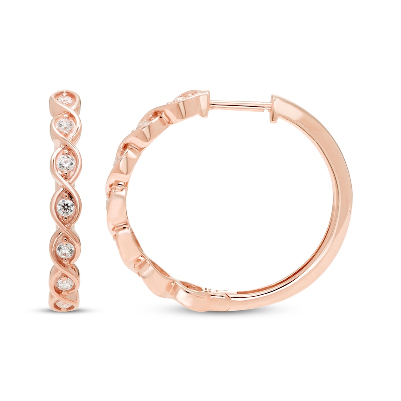 Life isn’t measured in minutes but in moments of love. These hoop earrings celebrate every moment you share—because every moment together is a gift. Each earring features round-cut diamonds surrounded by swirling infinity symbols. Styled in 14K rose gold, these hoops have a total diamond weight of 1/3 carat and secure with hinged backs. From the Every Moment collection, exclusively at KAY.