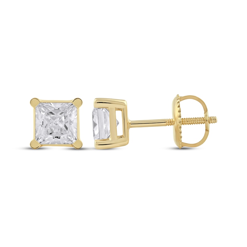 Stunning in their simplicity, these regal earrings showcase exquisite princess-cut lab-created diamonds, each independently certified and laser-inscribed with a unique Gemscribe® serial number to ensure your peace of mind. Crafted in 14K yellow gold, these post earrings have a total lab-created diamond weight of 1 1/2 carats and safely secure with screw backs. From the Lab-Created Diamonds by KAY collection.