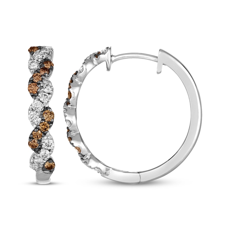 These luxurious Le Vian® hoop earrings from the KAY exclusive Chocolate Twist™ collection showcase intertwining rows of delicious round Chocolate Diamonds® and shimmering Nude Diamonds™ for a rich contrast. The silhouette is styled in luscious 14K Vanilla Gold®. With a total diamond weight of 3/4 carat, the earrings secure with hinged backs. Le Vian®. Discover the Legend.