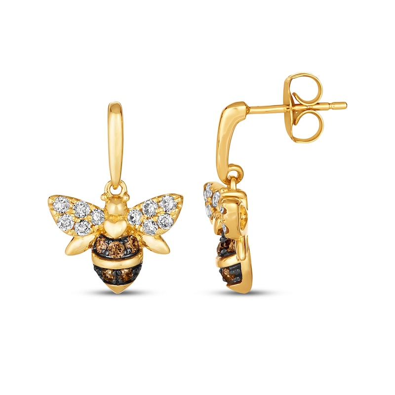 These cheerfully vibrant earrings from Le Vian® feature a sweetly suspended bee silhouette crafted in 14K Honey Gold™. Fluttering with Nude Diamonds™ and Chocolate Diamonds®, the earrings have a total diamond weight of 3/8 carat and secure at the posts with friction backs. Le Vian®. Discover the Legend.