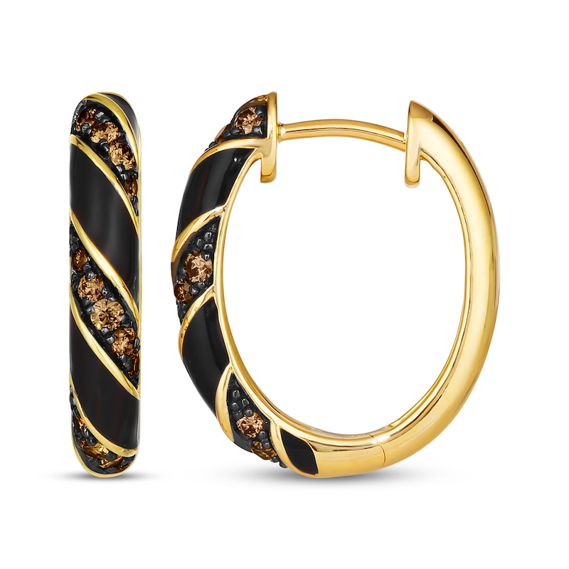 Sleek black enamel is a delicious twist in these hoop earrings from Le Vian®. Rich round Chocolate Diamonds® in black rhodium plate are set on the diagonal in between polished and enameled twists. Styled in 14K Honey Gold™ with a total diamond weight of 3/8 carat, these earrings secure with hinged backs. Le Vian®. Discover the Legend.