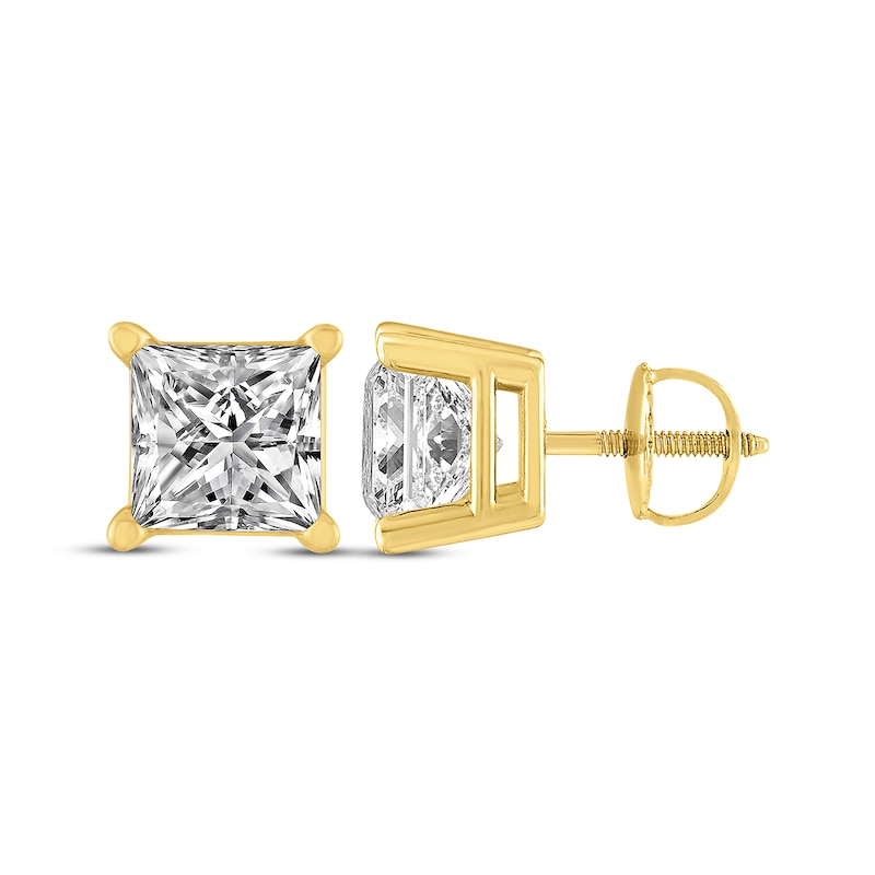 - Each earring shimmers with a princess-cut diamond solitaire