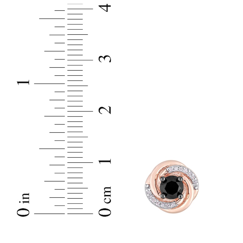 A dramatic display, these stud earrings make a splendid statement. Crafted in 10K rose gold, each earring features a round-cut 1/2-carat black diamond in black rhodium wrapped in a whirlwind of round-cut white diamond accents in white rhodium. The earrings have a total diamond weight of 1 1/10 carats and secure with friction backs.