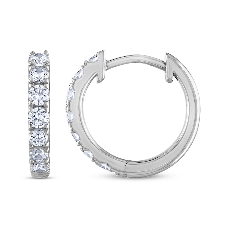 - Independently certified round-cut diamonds shimmer along the front of each hoop.