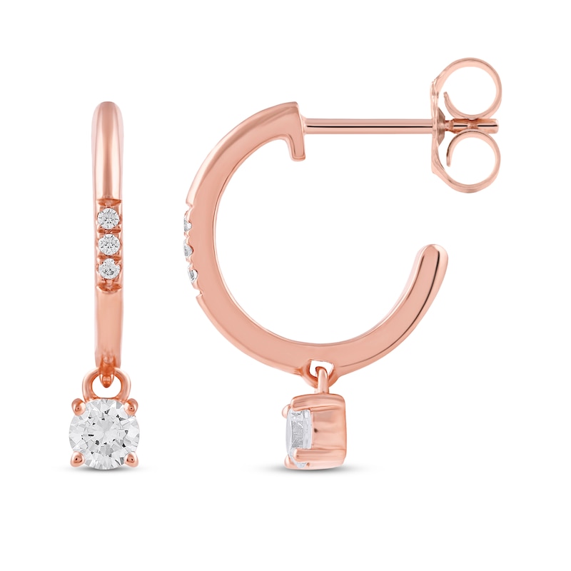 - A single round diamond dangle, artfully set to enhance size and sparkle, continuously catches the light and sparkles from every angle—just like your love