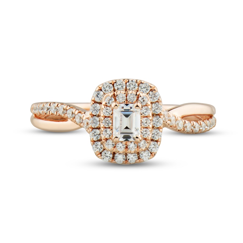 Captivaiting and charming, this engagement ring for her showcases a stunning emerald-cut diamond dazzling at its center. The middle is haloed by radiant round diamonds that adorn either side of the split band. Fashioned in romantic 14K rose gold, this ring has a total diamond weight of 1/2 carat and is from our Now and Forever® bridal collection.