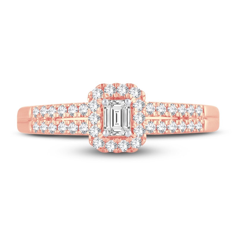A stunning emerald-cut diamond sparkles at the center of this chic engagement ring for her. Set in dreamy 14K rose gold, brilliant round diamonds halo the center stone and shimmer down the band in dual rows. The ring has a total diamond weight of 3/8 carat. From the Now & Forever® bridal collection.