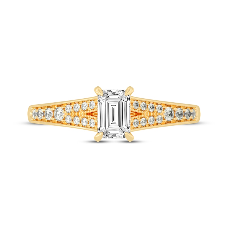 Make the moment special with this sparkling engagement ring. Its shimmering focal point is a 1/2-carat emerald-cut diamond. Beneath the center stone, milgrain detailing and round-cut diamonds wrap the gallery. More round-cut diamonds and milgrain line the 14K yellow gold split-shank look. This ring has a total diamond weight of 3/4 carat. From the Now & Forever® bridal collection.