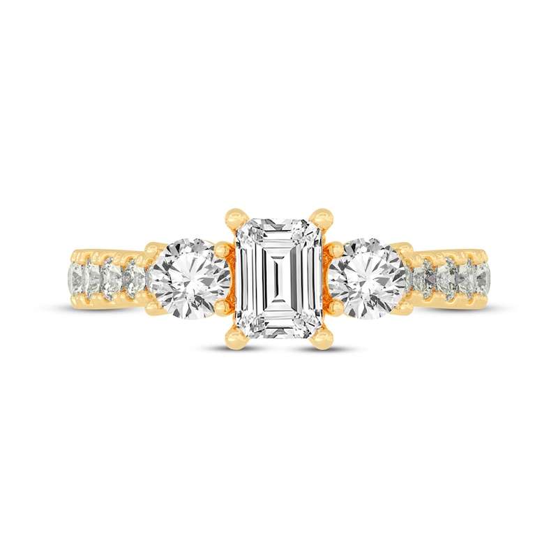 Say "yes!" to the sparkling symbolism of this beautiful three-stone diamond engagement ring. An elegant emerald-cut diamond shines even brighter when set amidst two radiant round-cut diamonds. Extra round-cut diamonds dance down the sides of the band for a total diamond weight of 2 carats. Styled in 14K yellow gold, the ring is featured in our Now & Forever® bridal collection.