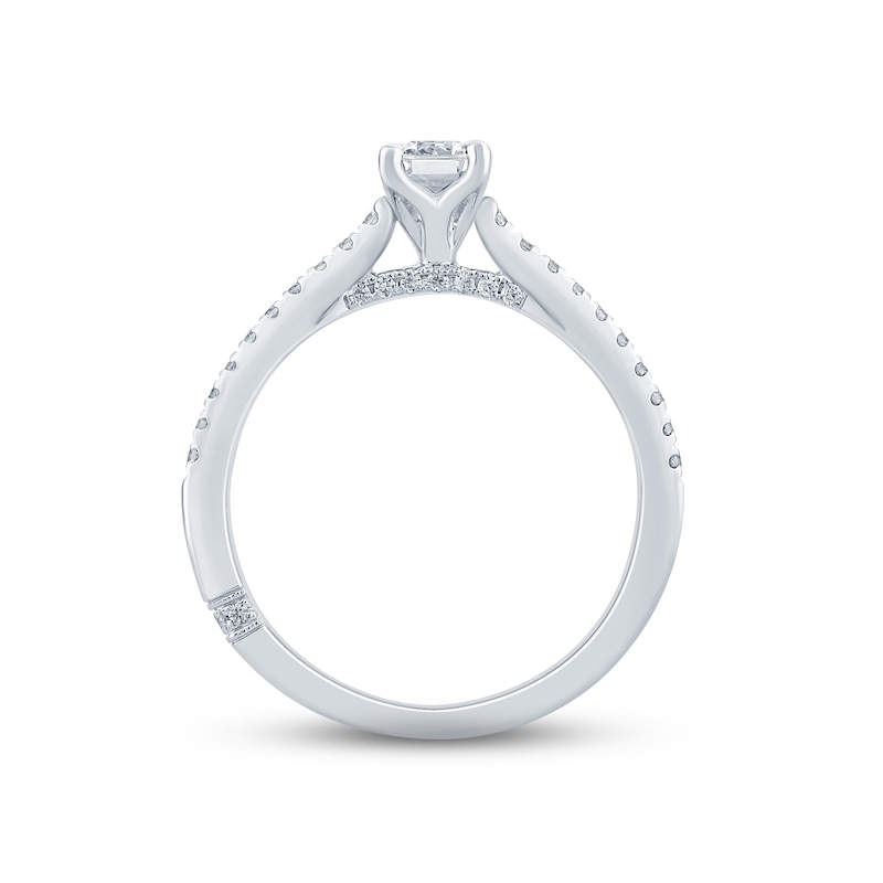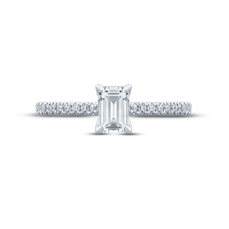 This splendid engagement ring showcases a dazzling 1/2-carat emerald-cut diamond as the shining focal point. Bright round-cut diamonds shimmer down the band and across the bridge for a total diamond weight of 5/8 carat. The ring is crafted in iconic 18K white gold and finished by classic milgrain detailing. The independently certified center diamond is laser-inscribed with a unique Gemscribe® serial number to ensure your peace of mind. From the Monique Lhuillier Bliss collection, available exclusively at KAY. Please note: This ring is available in limited sizes. If you don't see your size here, please visit a store to order your ring.