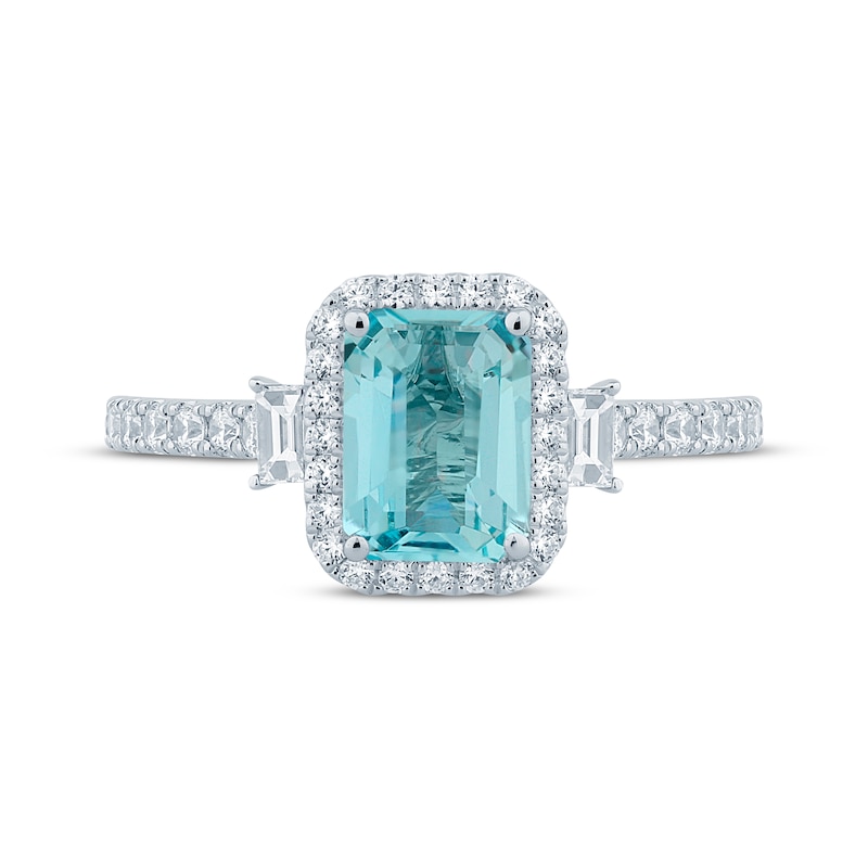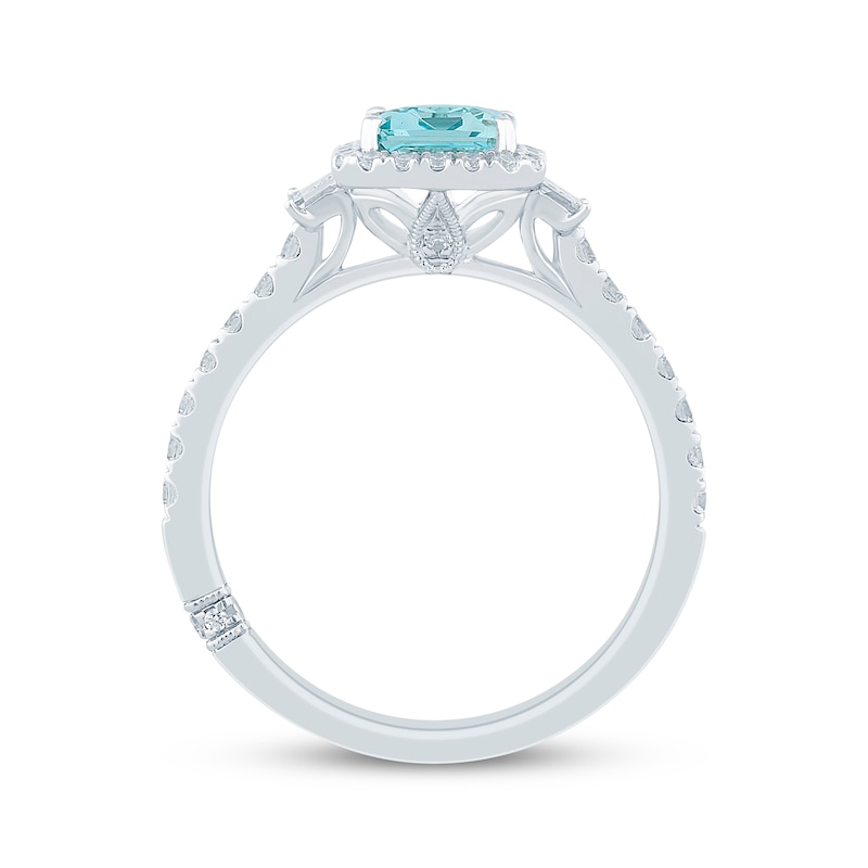 Captivate your one and only with the serene hue of this aquamarine and diamond engagement ring. This style is created in iconic 14K white gold. At the center, an emerald-cut aquamarine shines with beautiful color. A frame of shimmering round-cut diamonds surrounds the center stone, flanked by baguette-cut diamonds. Adding even more sparkle, round diamonds dance down the band and adorn the milgrain-touched gallery. A signature element of diamonds in milgrain detailing encircles the band, symbolizing unity and eternal love. The ring has a total diamond weight of 1/2 carat. From the Monique Lhuillier Bliss collection, available exclusively at KAY. Please note: This ring is available in limited sizes. If you don't see your size here, please visit a store to order your ring.