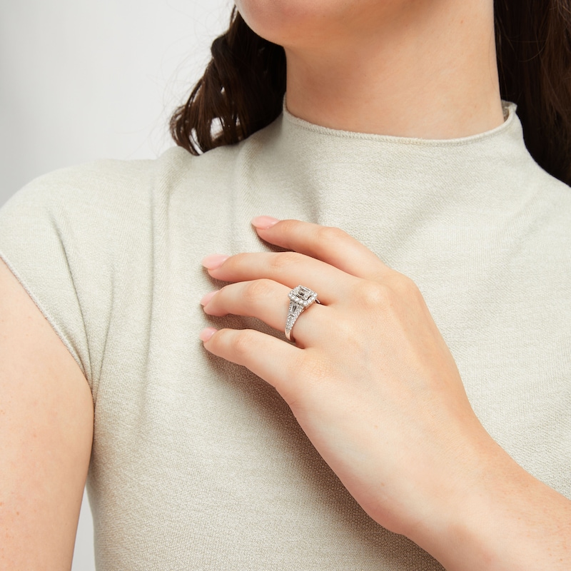 A stellar emerald-cut diamond is framed in lovely round diamonds at the center of this engagement ring from Neil Lane Bridal®. Baguette diamonds adorn each side of the center, with round diamonds flowing along the band of 14K white gold. The ring has a total diamond weight of 1 7/8 carats.