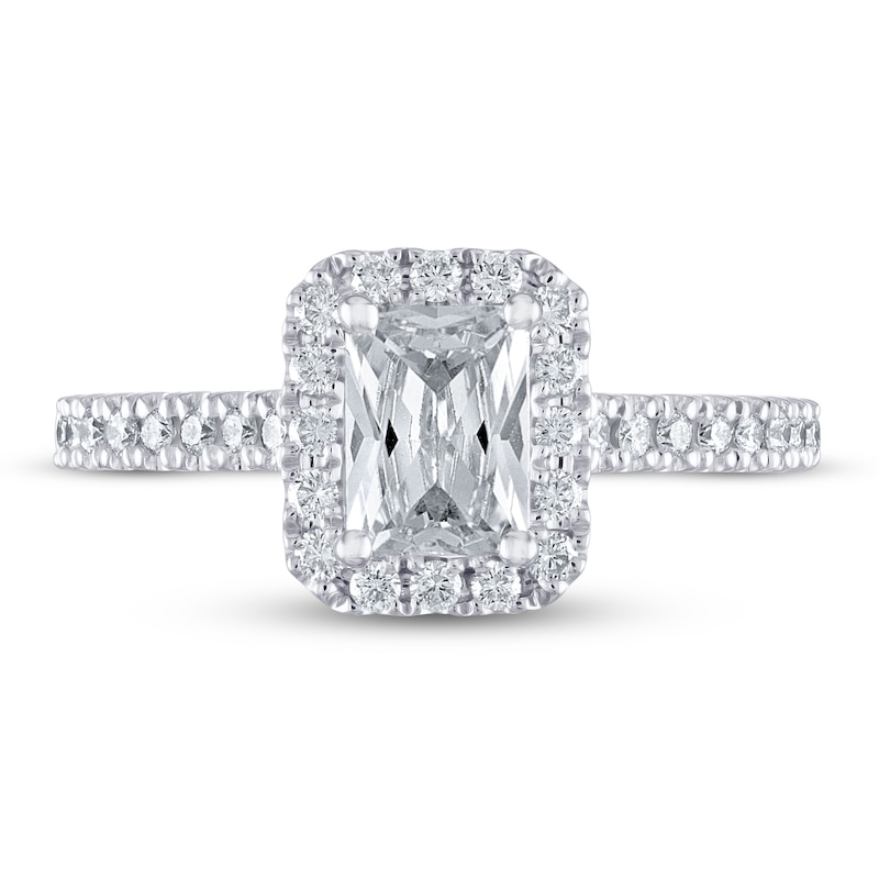 An elegant 1 carat emerald-cut diamond shines brightly in this stunning engagement ring from THE LEO Diamond® collection. Round diamonds halo the independently-certified center stone and down each side of the 14K white gold band to give the ring a total diamond weight of 1 1/4 carats. The center diamond is laser-inscribed with a unique Gemscribe® serial number for your peace of mind.