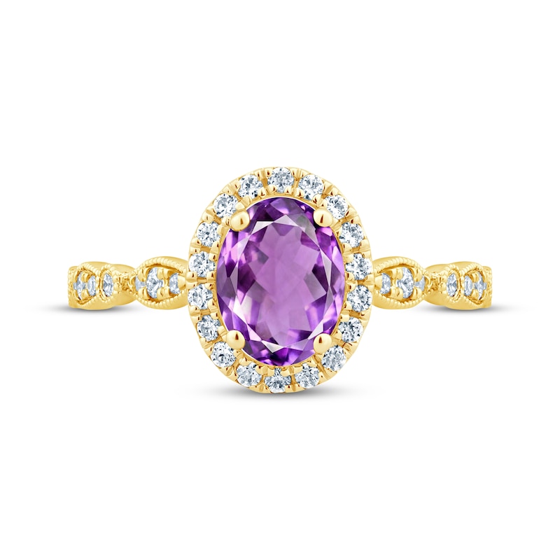 Fall for the unconventional beauty and dreamy hue of this exceptional engagement ring. A vibrant oval-cut amethyst draws the eye, haloed by sparkling round diamonds at the center. More round diamonds twinkle in milgrain-accented settings along the band, which is crafted in warm 14K yellow gold. The ring has a total diamond weight of 1/3 carat. From the Now & Forever® bridal collection.
