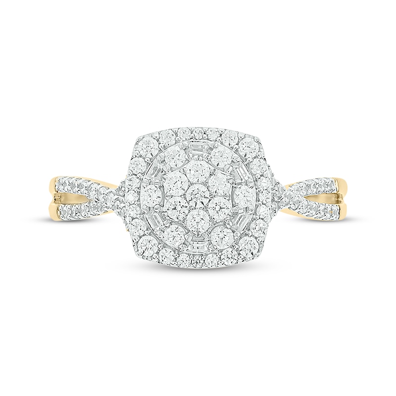 Go for the fabulous shine of this eye-catching engagement ring. Fashioned in 14K yellow gold, the design displays a composite of baguette- and round-cut diamonds in white rhodium plate embraced by a cushion-shaped frame of round diamonds. More sparkling round diamonds dance down the split twist shank for a total diamond weight of 1/2 carat. From the Now & Forever® bridal collection.