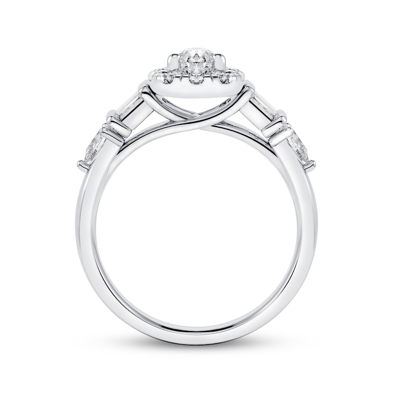 A gorgeous 1/2-carat pear-shaped diamond shines at the center of this mesmerizing engagement ring for her. Set in iconic 14K white gold, brilliant round diamonds halo the center stone and chic baguette-cut diamonds line each side. Two pear-shaped diamonds finish the design, giving the ring a total diamond weight of 1 1/4 carats. From the Now & Forever® bridal collection.