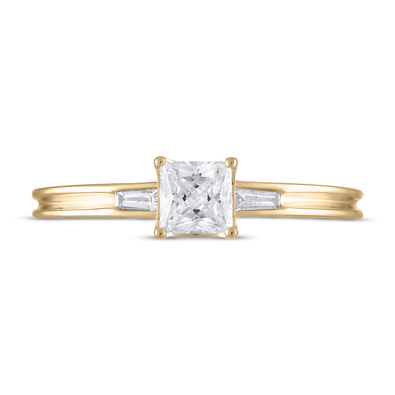 Simple and chic, this beautiful engagement ring showcases a 1/2-carat princess-cut diamond at its center. Set in timeless 14K yellow gold, two baguette-cut diamonds gleam on each side for a total diamond weight of 1/2 carat. The gender-neutral ring is available in sizes 5-12.