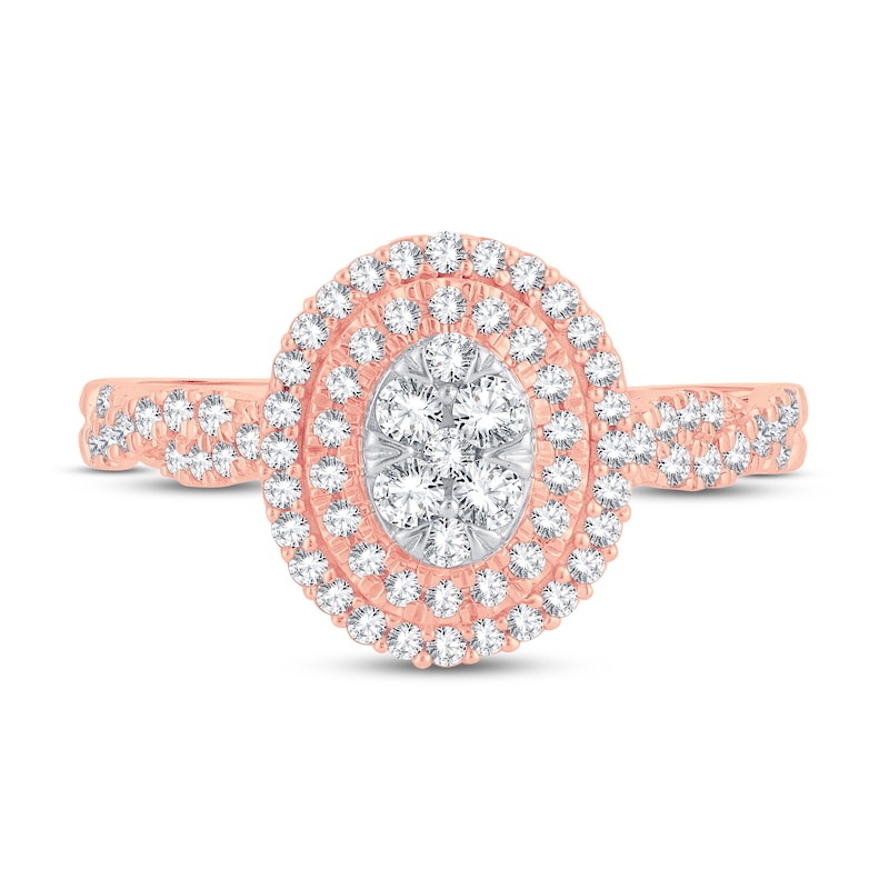 A brilliant cluster of round diamonds sparkles at the oval-shaped center of this chic engagement ring for her. Set in dreamy 10K rose gold, a double halo of round diamonds surrounds the center, and more diamonds shimmer down the twisted band. The ring has a total diamond weight of 1/2 carat. Form the Now & Forever® bridal collection.