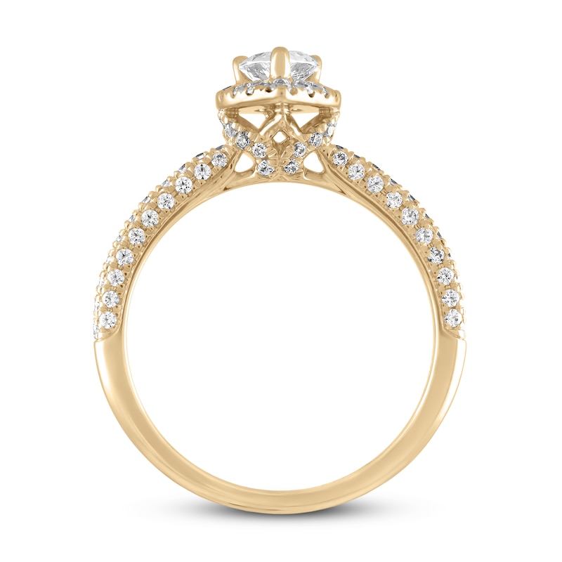 This gorgeous diamond engagement ring exudes stunning style and is perfect for that memorable moment. The firey pear-shaped diamond bursts brilliantly from the center and is embraced by a halo of radiant round-cut diamonds. Additional round-cut diamonds adorn the sides of the band, enriching the distinctive yellow gold setting. The ring has a total diamond weight of 1 carat and is from the Now and Forever® bridal collection.