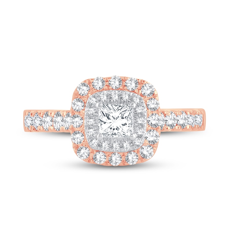 A gorgeous 1/3-carat princess-cut diamond sparkles at the center of this luxe engagement ring, haloed by two frames of brilliant round diamonds. The 14K rose gold band showcases more round diamonds on each side, and two bezel-set round diamonds shimmer under the head to finish the look. The ring has a total diamond weight of 1 carat. From the Now & Forever® bridal collection.