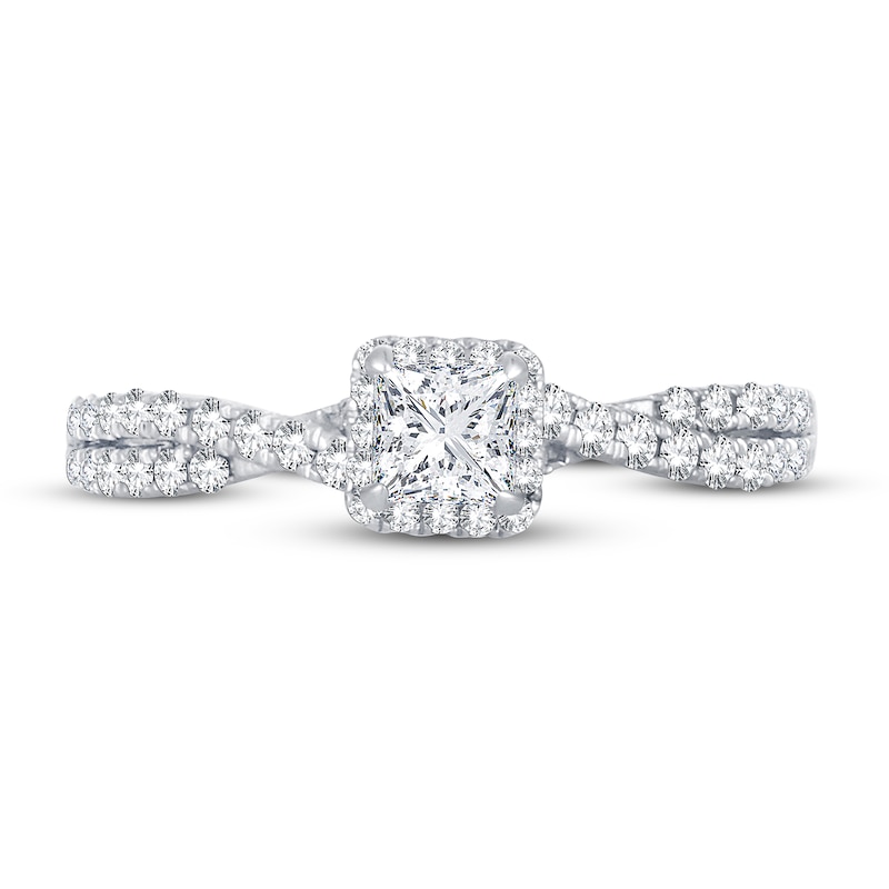 A beautiful princess-cut diamond sparkles at the center of this engagement ring for her. Brilliant round-cut diamonds halo the center, and more flow down the twisted band for a total diamond weight of 3/4 carat. The ring is fashioned in classic 14K white gold. From the Now & Forever® bridal collection.
