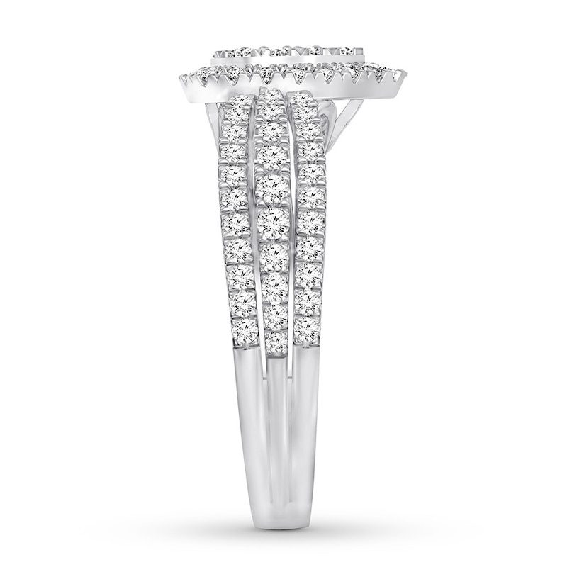 Awash in sparkling round diamonds, this elegant engagement ring features a teardrop design in the center and three rows on the band. The 14K white gold ring has a total diamond weight of 3/4 carat.