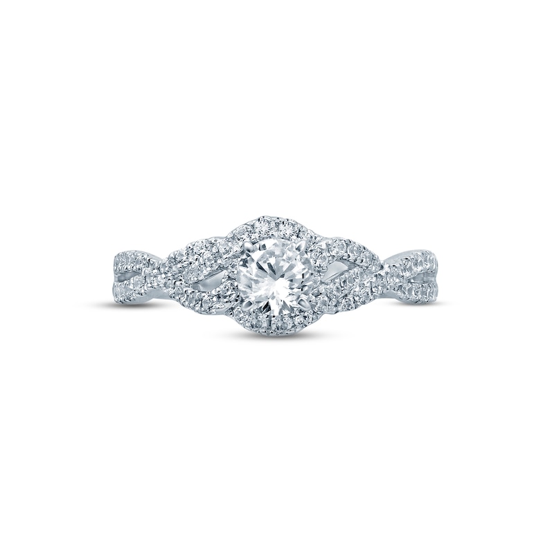 A luminous 3/8-carat round diamond sparkles at the center of this alluring engagement ring for her. Ribbons of radiant round diamonds wrap around the center diamond and sparkle along the ornately twisted, split-shank band. Fashioned in iconic 14K white gold, the ring has a total diamond weight of 3/4 carat. From the Now & Forever® bridal collection.