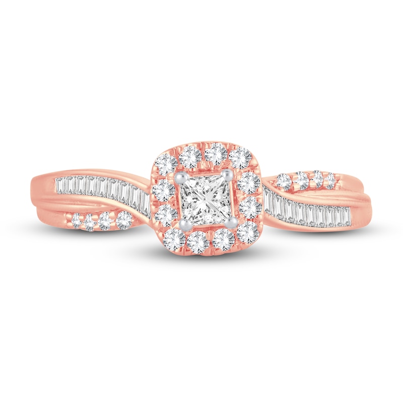 Elegant and unique, this engagement ring showcases a princess-cut diamond at the center, haloed by brilliant round diamonds. Gorgeous round and baguette-cut diamonds weave down the sides of the band, giving the ring a total diamond weight of 3/8 carat. The ring is crafted in dreamy 14K rose gold and from the Now & Forever® bridal collection.