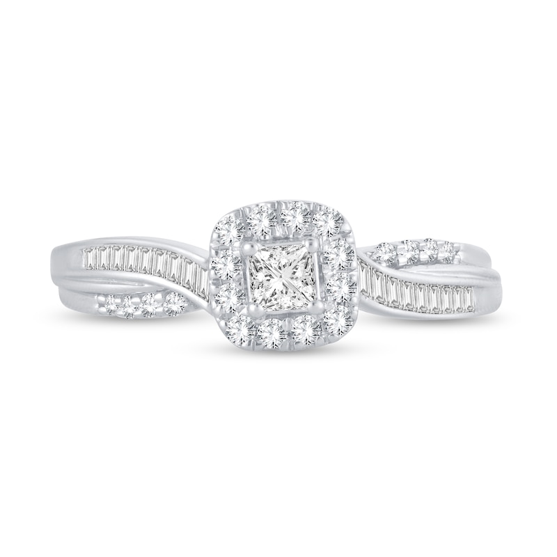 - Diamond Engagement Ring 3/8 ct tw Princess, Round & Baguette White Gold Plated