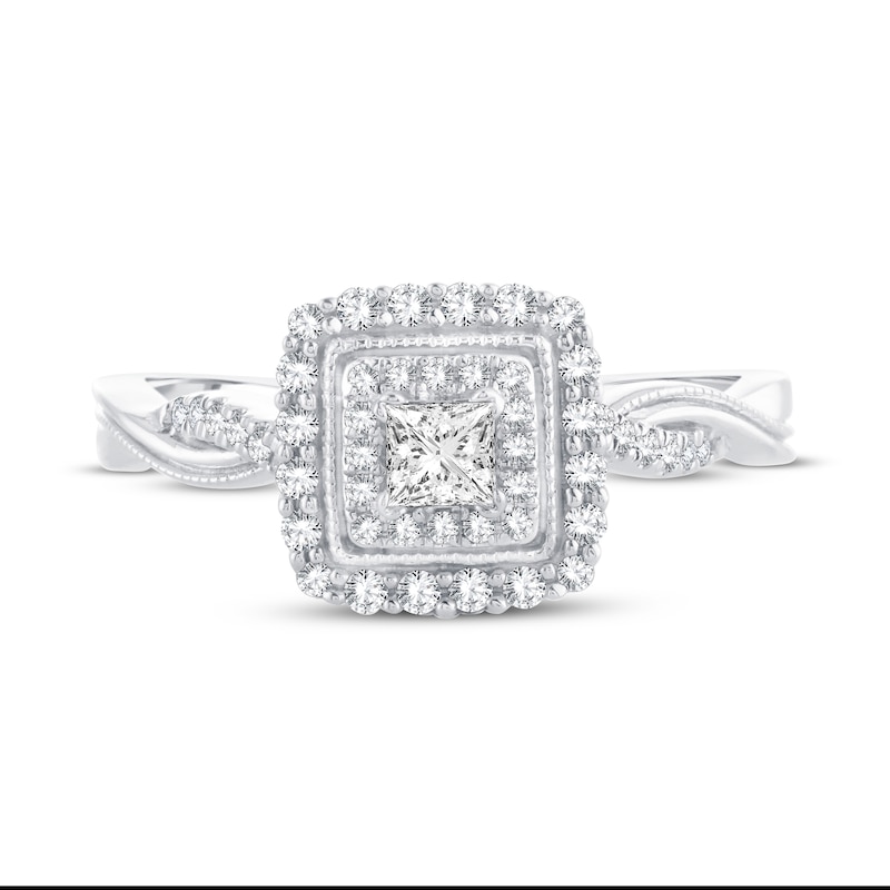This breathtaking engagement ring showcases a gorgeous princess-cut diamond at the center, framed by a double halo of brilliant round-cut diamonds. More round diamonds flow down the twisted band for a total diamond weight of 3/8 carat. The ring is crafted in iconic 14K white gold and is finished with classic milgrain detailing. From the Now & Forever® bridal collection.