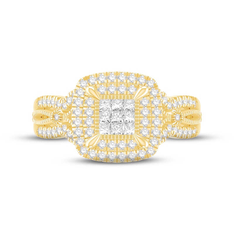 This luxe engagement ring for her displays an array of princess-cut diamonds framed in two rows of delicate round-cut diamonds. More round diamonds sweep down the timeless 10K yellow gold band, bringing the total diamond weight to 5/8 carat. From the Now and Forever® bridal collection.
