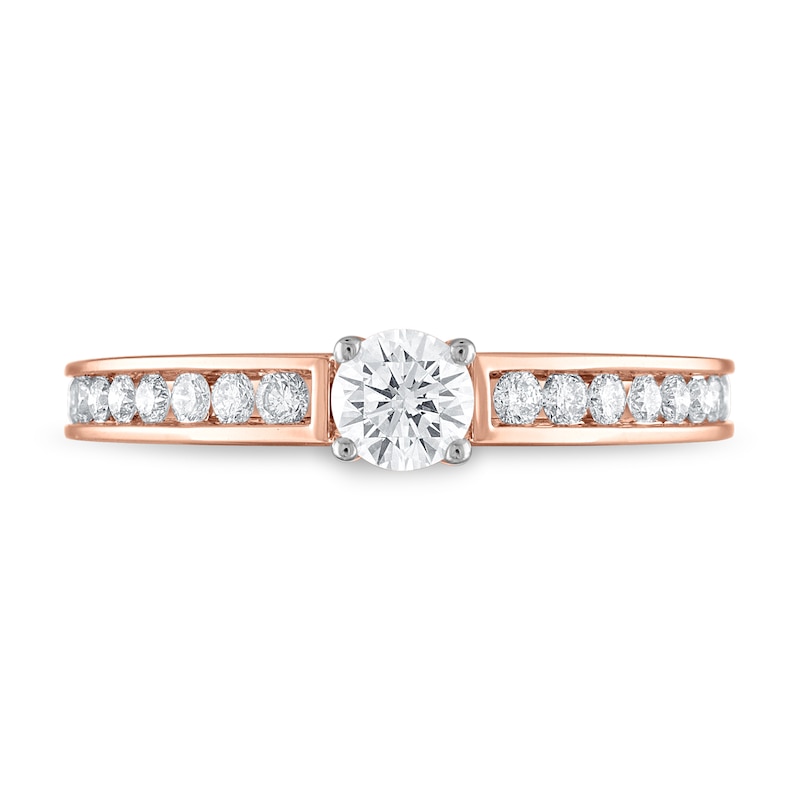 A brilliant round-cut diamond sparkles at the center of this classic diamond engagement ring for her. More round-cut diamonds are channel-set down each side of the 14K rose gold band. The ring has a total diamond weight of 5/8 carat. From the Now & Forever® bridal collection.