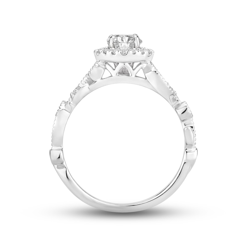 Intricate and eye-catching, this gorgeous engagement ring for her displays a radiant 1/2-carat round diamond haloed in shimmering round diamonds. Brilliant round diamonds sparkle amid swirls of 14K white gold, complemented by classic milgrain accents. The ring has a total diamond weight of 5/8 carat and is from our Now and Forever® bridal collection.