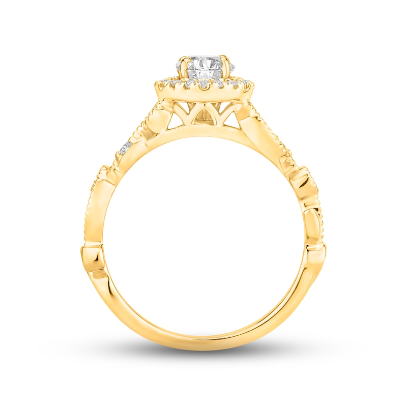 This ravishing engagement ring for her showcases a stunning 1/2-carat round-cut diamond haloed by radiant round diamonds. Dainty round diamonds sparkle amid intricate swirls of timeless 14K yellow gold, with milgrain accents finishing the look. The ring has a total diamond weight of 5/8 carat and is from our Now and Forever® bridal collection.