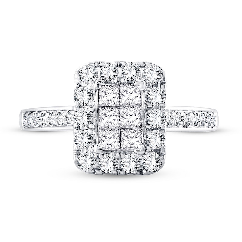 Six princess-cut diamonds are framed in sparkling round diamonds at the center of this magnificent engagement ring Additional round diamonds adorn the 10K white gold band, bringing the total diamond weight to 7/8 carat.