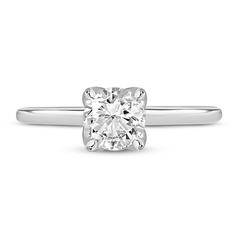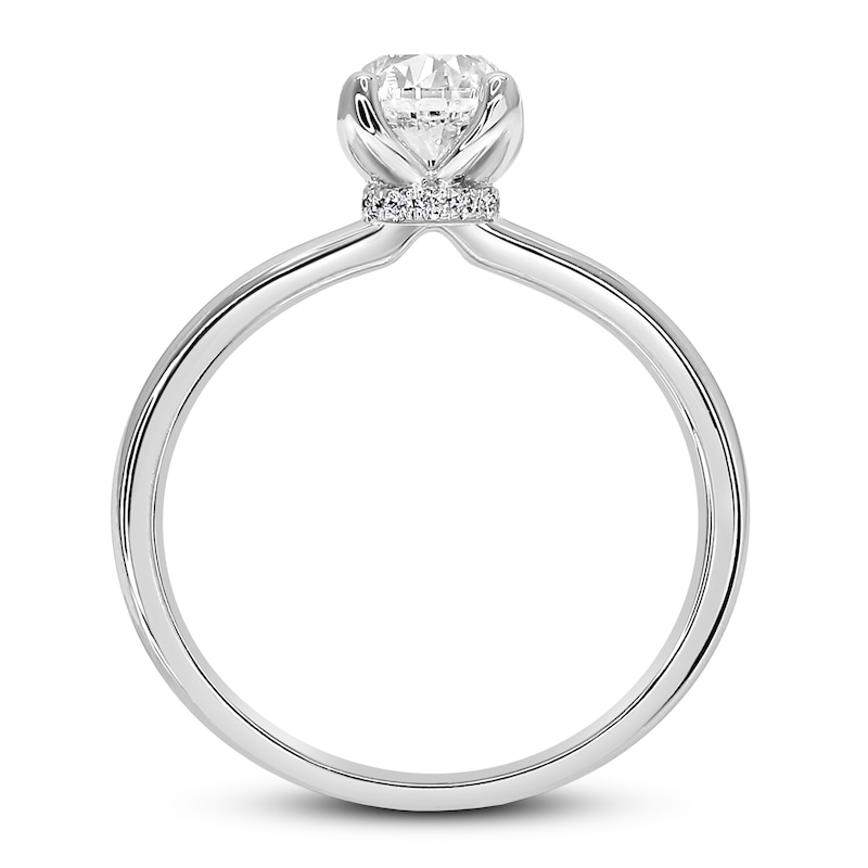 This stunning diamond solitaire engagement ring for her features a 1-carat GIA-graded round-cut diamond at its center, set in chic 18K white gold. Radiant round-cut diamonds shimmer below the center setting for surprise sparkle. The ring has a total diamond weight of 1 carat. From the Now & Forever® bridal collection.