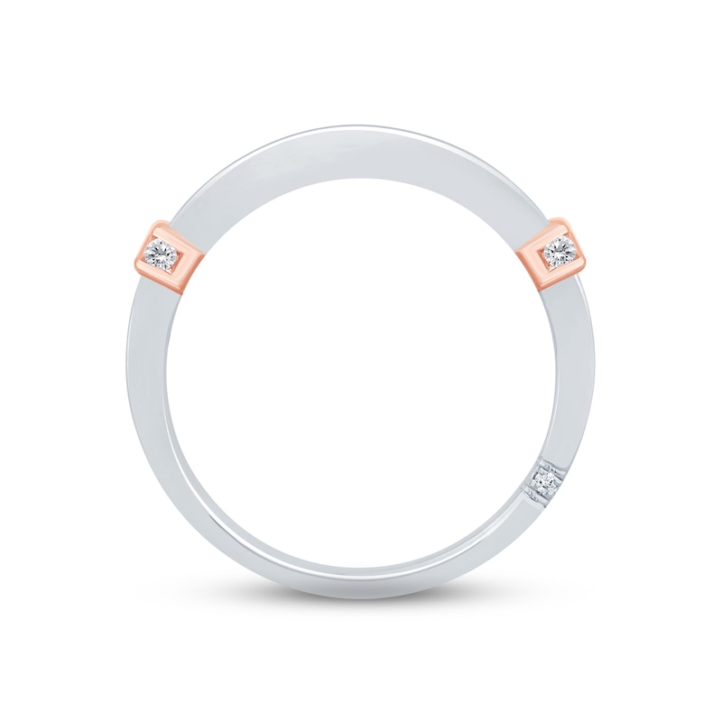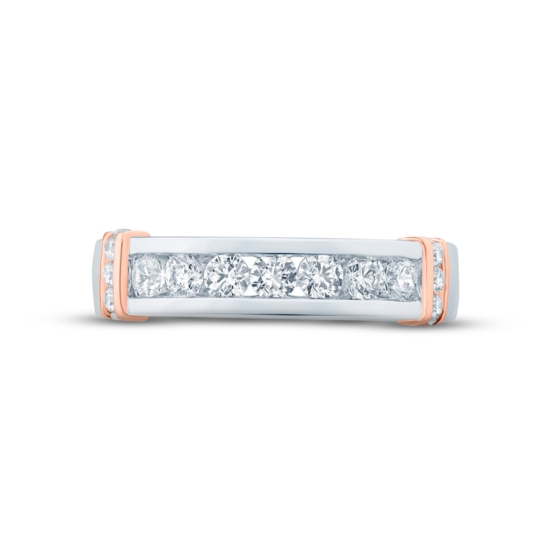 This striking wedding band features a radiant row of channel-set round-cut diamonds. A chorus of round diamonds artfully frames the center when fashioned in 18K rose gold. A signature element of diamonds encircles the ring, symbolizing unity and eternal love. Styled in 18K white gold, the independently certified diamonds total 1/2 carat in weight. From the Monique Lhuillier Bliss collection, available exclusively at KAY. Please note: This ring is available in limited sizes. If you don't see your size here, please visit a store to order your ring.