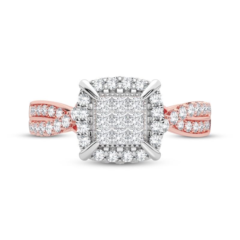 This show-stopping engagement ring features a brilliant array of princess-cut diamonds framed in brilliant round diamonds and styled in white rhodium at the center. More brilliant round diamonds sweep down the gracefully twisted band, which is crafted in beautiful 10K rose gold. The ring has a total diamond weight of 3/8 carat and is from our Now & Forever® bridal collection.