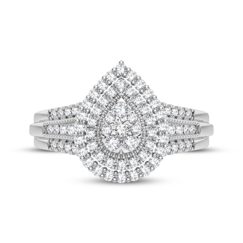 A brilliant array of round diamonds gleams on the pear-shaped composite center of this beautiful engagement ring. Three rows of shimmering round diamonds dance partway down the band for a total diamond weight of 1/3 carat. The ring is crafted in modern 10K white gold with milgrain accents. From the Now & Forever® bridal collection.